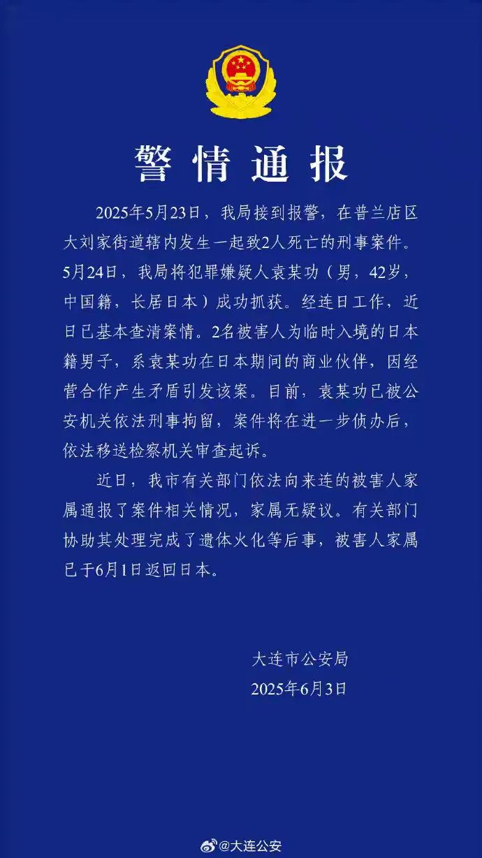 2025年5月23日,我局接到报警,在普兰店区大刘家街道辖内发生一起致2人死亡的刑事案件。5月24日,我局将犯罪嫌疑人袁某功(男,42岁,中国籍,长居日本)成功抓获。经连日工作,近日已基本查清案情。2名被害人为临时入境的日本籍男子,系袁某功在日本期间的商业伙伴,因经营合作产生矛盾引发该案。目前,袁某功已被公安机关依法刑事拘留,案件将在进一步侦办后,依法移送检察机关审查起诉。