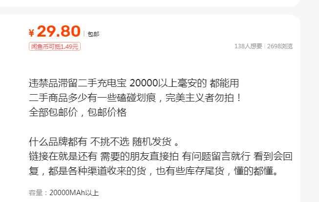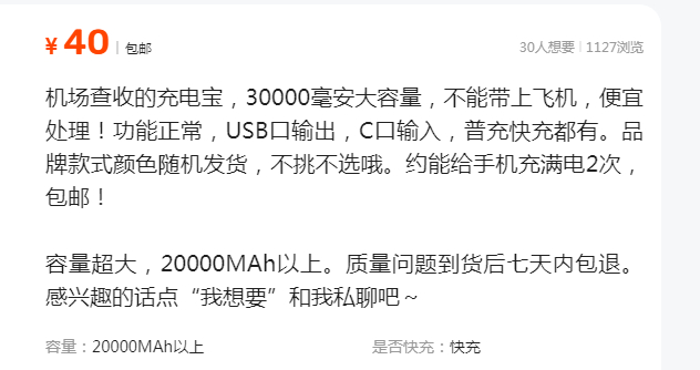 “违禁品滞留二手充电宝,20000以上毫安的都能用,什么品牌都有,随机发货。都是各种渠道收来的货,也有些库存尾货,懂的都懂!”有卖家如此描述。还有卖家直接挑明,称是从机场拿的货。“机场拿的一批二手充电宝,特价处理,大概能充3次,质量问题七天无理由退货。”另一个帖子关于充电宝的介绍也是直接明了,“机场查收的充电宝,不能带上飞机,便宜处理,品牌款式颜色随机发货,约能给手机充满电2次,包邮!”记者注意到,这些充电宝的价格很低,基本是30元左右,而对这样的售卖帖,关注的人还很多,甚至不少人表达了“想要”。记者也给相关卖家留言,询问充电宝的具体来源,不过未得到回复。