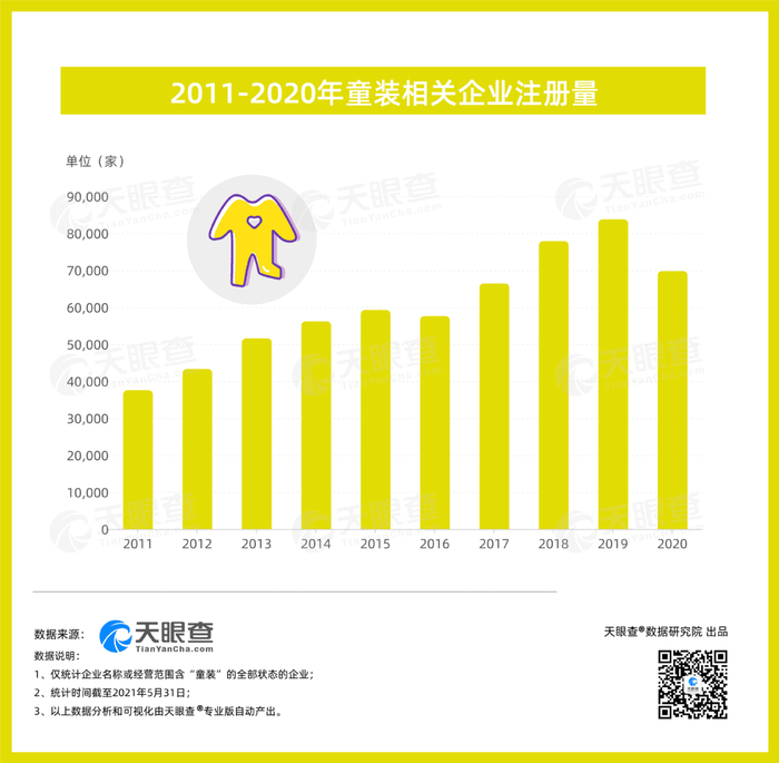 近几年来,童装相关企业数量持续增长,增速维持在10%以上。其中,2019年新增近8.4万家相关企业,为历史最高,其次是2018年,新增近7.8万家。