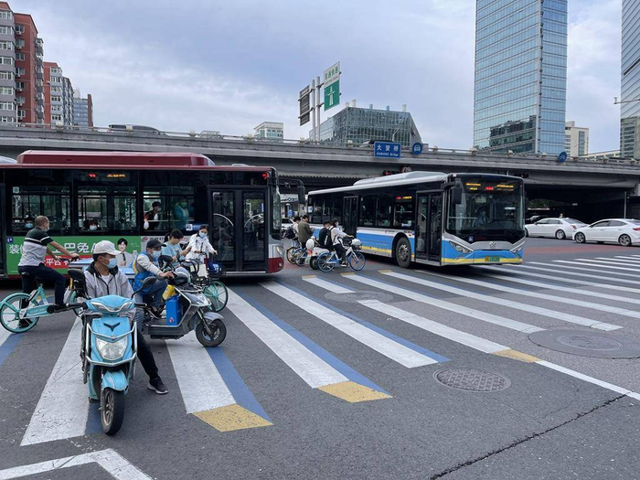 正值晚高峰,阜通西大街与广顺北大街路口的车辆川流不息。在广顺北大街路口,等红灯的20余位行人和骑行者都越过了停止线,纷纷站到了斑马线上,甚至堵住了机动车的半条车道。
