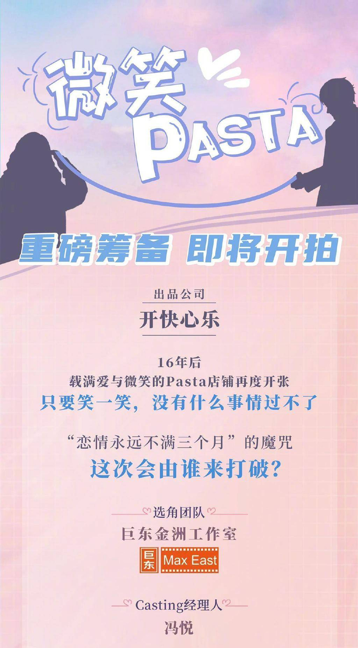 近日,还有影视制作公司宣布将翻拍王心凌剧集代表作《微笑Pasta》,并发布了演员招募信息。据悉,《微笑Pasta》于2006年7月16日开播,讲述了被爱情魔咒附身的年轻女生成晓诗(王心凌饰)与偶像乐团主唱何群(张栋梁饰)之间的一段浪漫爱情故事。在《微笑Pasta》中,何群和晓诗组成的“乌龟夫妇”,更是深得观众喜爱。两人因绯闻而邂逅在一起,在假扮情侣的过程中,渐渐地爱上了对方。