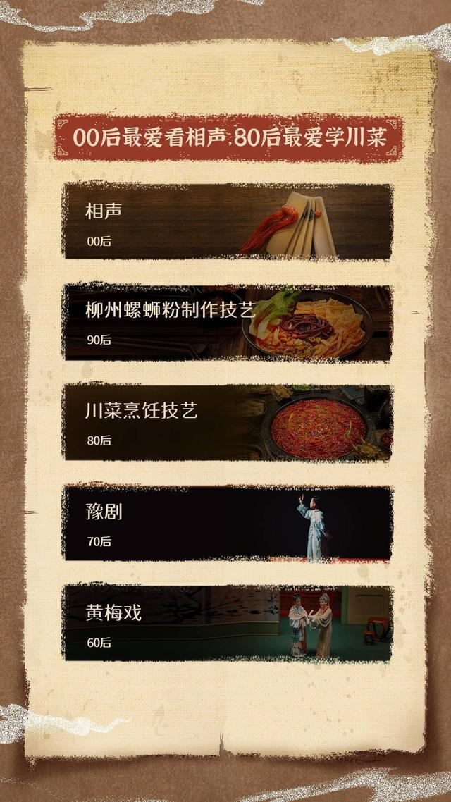 不同年龄人群在非遗项目上,有各自的偏好。00后爱看相声,90后喜欢学做柳州螺蛳粉,80后研习川菜烹饪技巧。更年长的人群则钟情于戏曲,70后追豫剧,60后听黄梅戏。在抖音观看非遗文化,正成为网友的习惯。