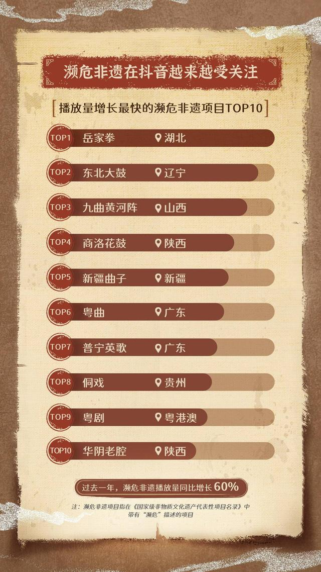 这些濒危非遗通过抖音等短视频平台重新获得关注。过去一年,抖音濒危非遗视频播放量同比增长60%。湖北的岳家拳、辽宁的东北大鼓、山西的九曲黄河阵等,成为抖音播放量增长最快的濒危非遗项目。