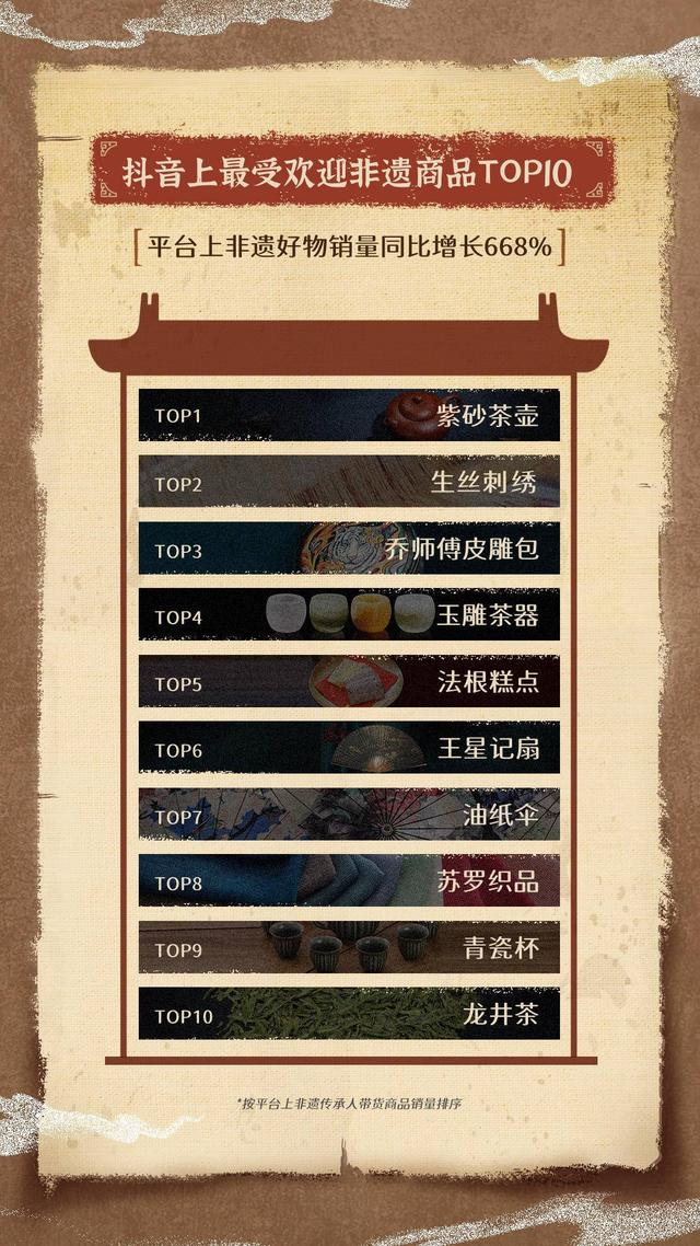 国家级非遗中的美食技艺也在抖音大放异彩,柳州螺蛳粉、烤全羊、川菜、龙须拉面和刀削面、沙县小吃、德州扒鸡、龟苓膏、桂林米粉、徽菜以及金华火腿等,占据了抖音网友喜爱的前10名榜单。