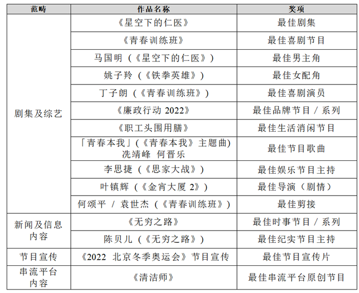 TVB一众艺员亦凭精湛演出获得殊荣,囊括多个重要奖项。剧集角色方面,马国明凭《星空下的仁医》获封“最佳男主角”;姚子羚凭《铁拳英雄》获“最佳女配角”奖项;丁子朗则凭《青春训练班》获“最佳喜剧演员”奖项。综艺节目方面,李思捷凭《思家大战》获得“最佳娱乐节目主持”奖项。另外,《2022北京冬季奥运会》节目宣传片获得“最佳节目宣传片”奖项。