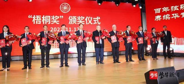 获得首届“梧桐奖”的老教师代表上台接受表彰