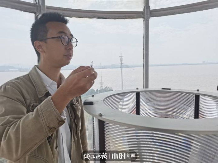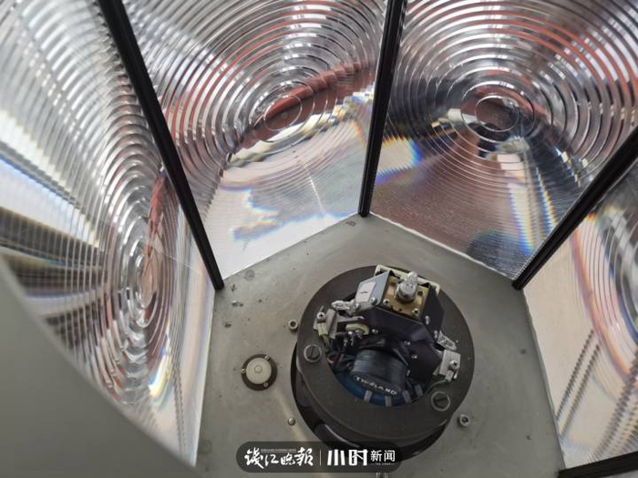 记者跟随叶超群从塔内旋梯登上塔顶,见到了传说中的航标塔灯。无论白天还是晚上,这盏灯永远都在旋转,一旦夜色到达临界点,通过感光阀自动开启,为远方的船只指引方向。白天的转动,是为了散热;夜晚的转动,可以达到5秒一闪的效果,起到灯塔指引的作用。