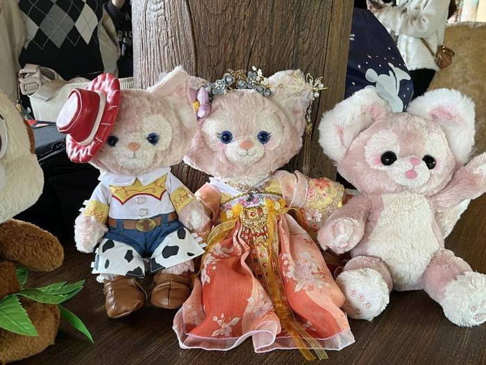 我像被淹没在一片粉色的海洋里。玲娜贝儿的发圈、发箍、挎包、背包、相机肩带、外套和尾巴装饰,小号、中号、大号的玲娜贝儿或是被抱在臂弯,或是用绳子系在背后,身上都穿着漂亮的小裙子。