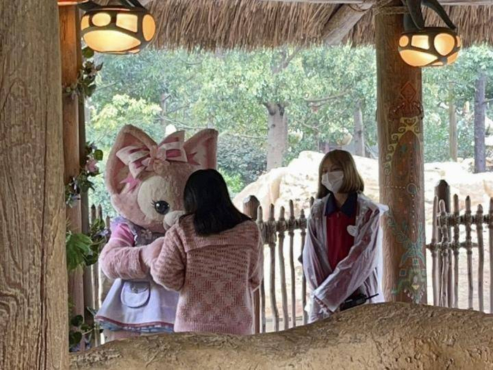 她毫不吝啬自己的拥抱,而我需要弯下腰才能抱住她毛茸茸的身体。鼻尖是部落丰盛堂里烤鸡饭的香气,周围是环绕的鼓点和郁郁葱葱的灌木丛。而她柔软的大爪子温暖地贴在后背,有一种令人安定的力量。只有当饲养员提醒不能碰玲娜贝儿的头或是尾巴时,我才如梦初醒:里面是一位会因为游客的不礼貌行为受到伤害的扮演者。对方身材娇小。