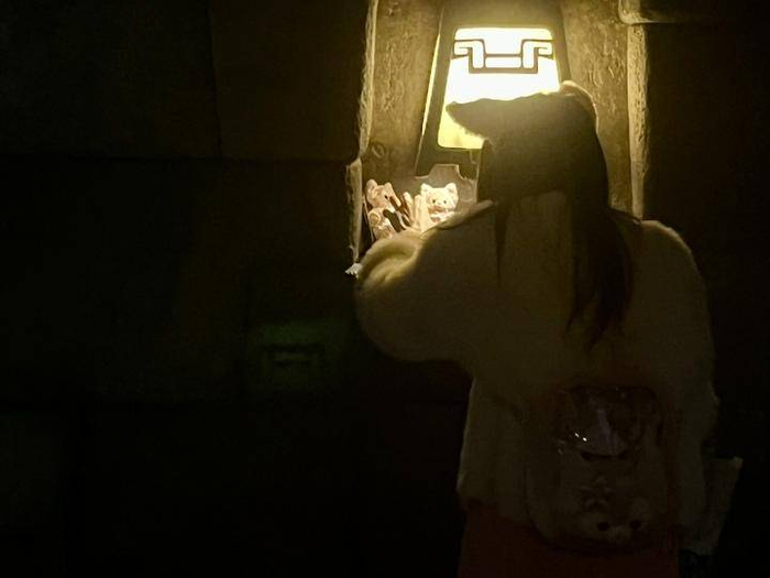 一位穿着粉色毛绒外套、背着玲娜贝儿书包的游客在岩壁前的庭灯前驻足。她轻轻拂去石台上的灰尘,从包里拿出两个漫月限定的玲娜贝儿挂件照相,明黄色的灯光照着小小的玲娜贝儿挂件和她头顶的狐狸耳朵。“来不及了,要去接孩子回家啦!”