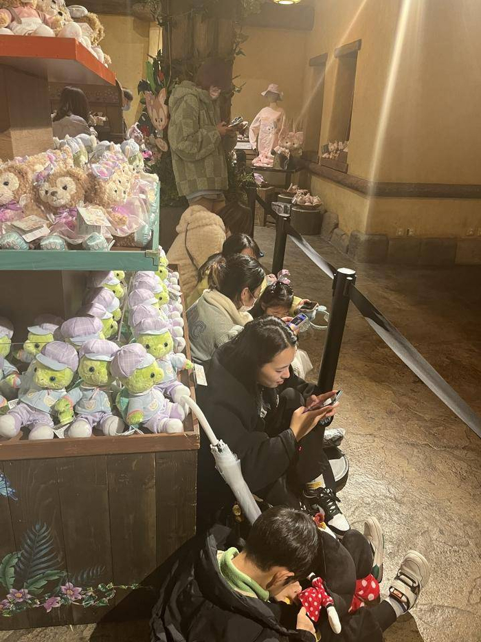 互动队伍已经切了,没排到互动的粉丝们坐在商店门口等待玲娜贝儿下班