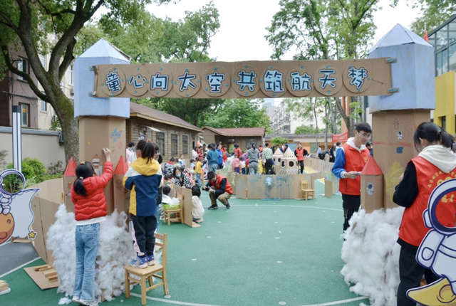 4月24日一早,用纸箱制作的巨大“火箭”与“空间站”屹立在南京航空航天大学幼儿园操场中,全园的小朋友们化身小小“航天员”,在老师们的积极引导与鼓励下,在酷似迷宫的“空间站”中大胆创作,通过绘画、拼图贴画、手掌印画等方式表现自己眼中、心中未来的空间站,绘出自己设计的载人飞船、载货飞船, 绘出遨游在太空中生活、工作、娱乐的航天员,绘出太空中种植培育的美丽植物、绘出自己的航天梦。