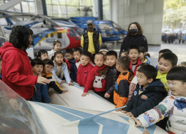 “哇!飞机好大”“你看,这里有火箭”“我喜欢直升机!”“战斗机最酷了!”在南京航空航天馆,讲解员放慢脚步用通俗易懂的方式讲解中国航空航天发展历程,引导孩子们对比观察比较相同与不同之处。“为什么这个飞机是圆头,那个飞机却是尖头呢?”“为什么这个飞机有两层机翼?”