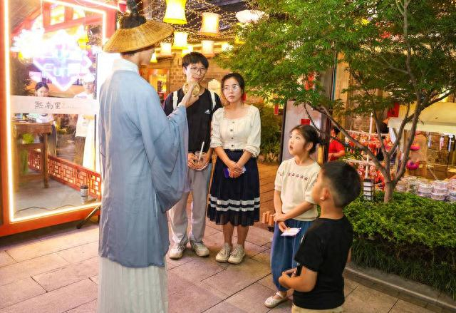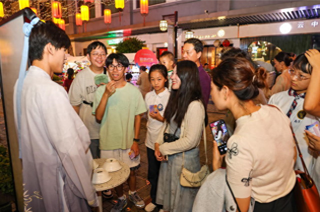 现场NPC化身为王羲之、孙绰和谢安三位文士,立于雅集点位,通过剧情演绎引导游客完成关卡游戏、收集印鉴,最终兑换“水韵江苏”主题礼品一份。深度的剧情互动与游艺打卡,让游客们沉浸式感受到中秋氛围,在参与中探索熙南里的特色,在体验中感受南京的历史底蕴。