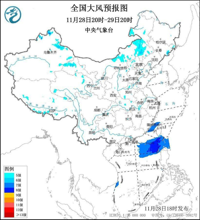 11月29日20时至30日20时,新疆北部和东部、西藏南部、内蒙古中部、甘肃河西以及福建东南部沿海、台湾岛西部等地部分地区将有5~6级、阵风7~8级的大风;东海南部、台湾海峡、巴士海峡、南海东北部海域将有7~8级、阵风9级的大风。