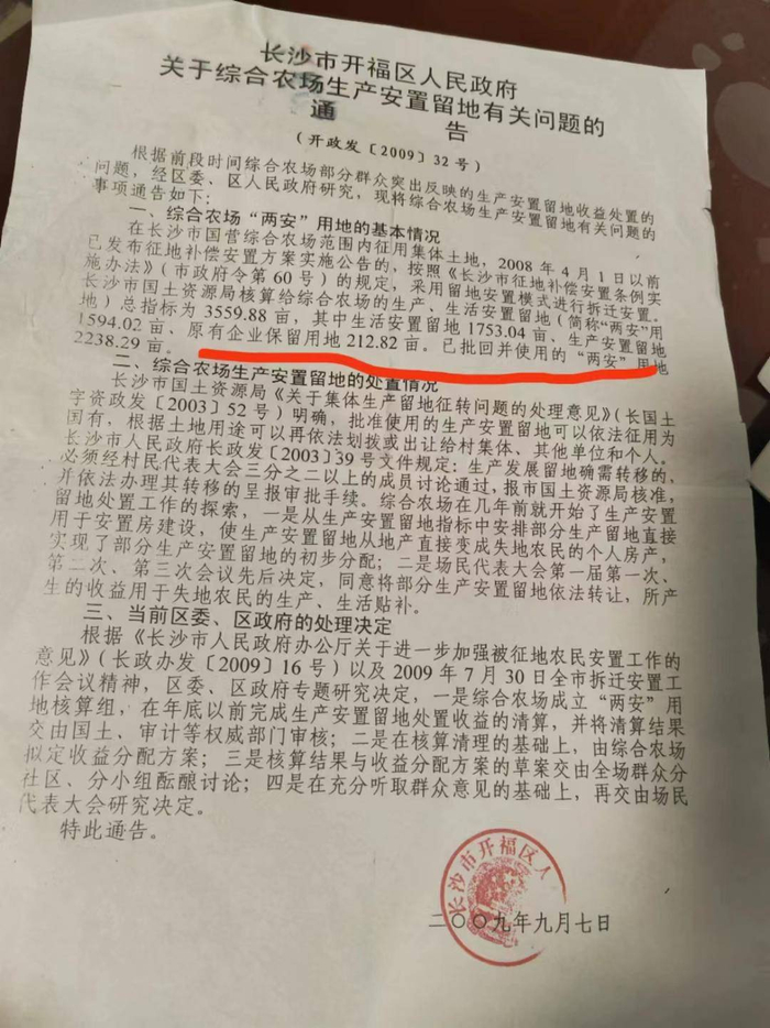 2009年9月7日,长沙市开福区政府发布《关于综合农场生产安置留地有关问题的通告》,针对的即为“综合农场部分群众突出反映的生产安置留地收益处置的问题”。