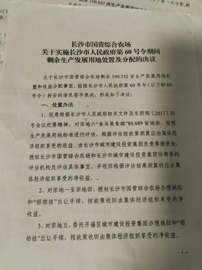 决议称,“关于长沙市国营综合农场剩余190.532亩生产发展用地处置和收益分配事宜,经按60号令拆安的场民签字表决,形成如下决议。”