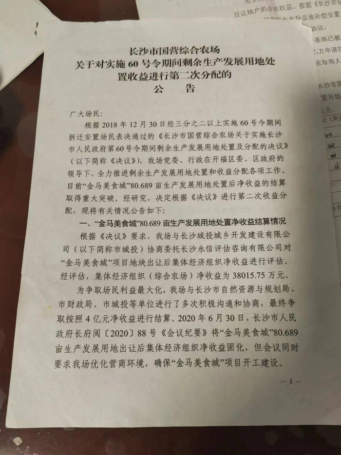 2020年9月1日,综合农场又进行了第二次4万元的分配。据长沙市国营综合农场发布的公告,此次分配后,剩余生产发展用地为109.843亩。