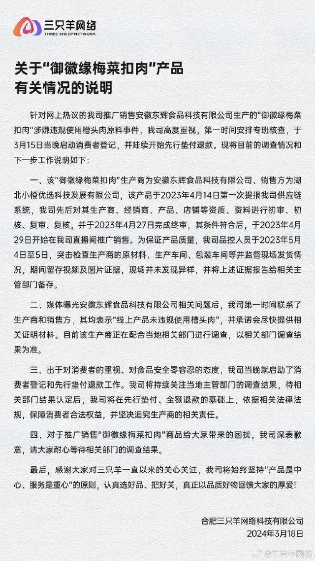 3月18日,“疯狂小杨哥”直播间所属的合肥三只羊网络科技有限公司(以下简称“三只羊网络”)发布说明称,针对网上热议的公司推广销售“御徽缘梅菜扣肉”涉嫌违规使用槽头肉原料事件,公司致歉,并已安排专班核查,启动消费者登记,陆续开始先行垫付退款。