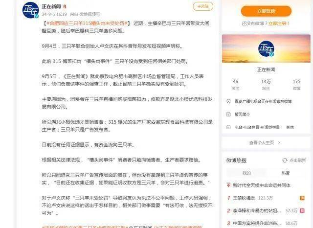 9月5日,青岛市广播电视台《正在新闻》就此事致电合肥市高新区市场监督管理局,工作人员表示,他们负责该事件的调查工作,截止目前三只羊确实没有受到处罚。主要原因为,消费者在三只羊直播间购买梅菜扣肉,收款方是湖北小橙优选科技发展有限公司。