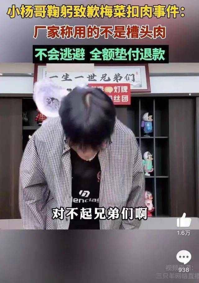 近日,小杨哥在直播间就梅菜扣肉事件向消费者鞠躬致歉。他表示,尽管厂家出了很多证明,证明所售五花肉不是槽头肉,但他们还是以当地相关部门的认定结果为准,一定给大家一个满意的结果。现在先行给大家垫付,在全额退款的基础上依据相关法律法规售后。