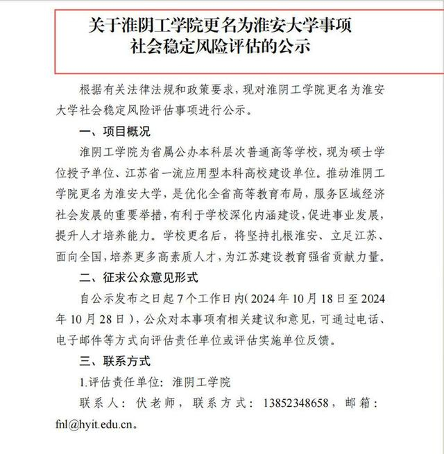 今年10月18日,淮阴工学院官网发布《关于淮阴工学院更名为淮安大学事项社会稳定风险评估的公示》