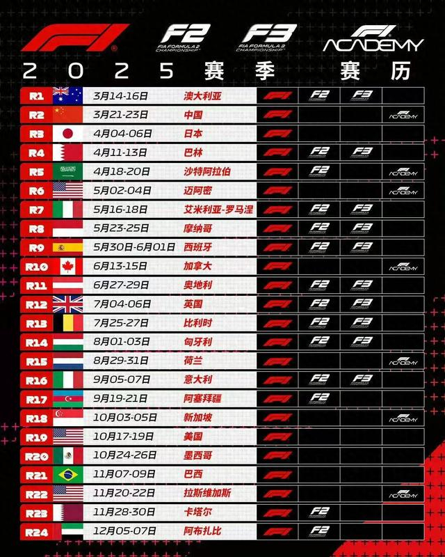 2025赛季F1将继续保留冲刺赛环节,全年共安排6场冲刺赛,分别将在中国、迈阿密、比利时、美国、巴西以及卡塔尔大奖赛上演。同时,澳大利亚、巴林、沙特阿拉伯、罗马涅、摩纳哥、西班牙、奥地利、英国、比利时、匈牙利、意大利、阿塞拜疆、卡塔尔和阿布扎比这12个分站赛比赛场地,还将承担举办F2、F3等赛事的重任。