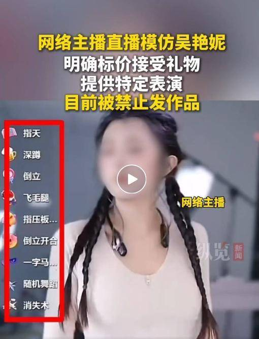 据媒体报道,这名主播通过模仿吴艳妮的穿着、妆容以及标志性动作吸引观众打赏,并以明确标价的方式接受礼物,提供特定表演,如跳舞、一字马或吴艳妮赛前的经典动作。直播视频显示,该主播将头发扎成和吴艳妮同款的四股麻花辫,并在直播间模仿吴艳妮晃肩、单手指向天等动作。不少网友认为,通过借助运动员形象进行变现,极其不尊重运动员本人。