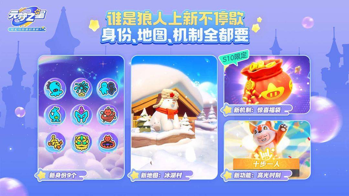 在谁是狼人中,新增冰湖村地图、惊喜福袋以及高光时刻功能,年年、闹闹等9个全新平民、中立及狼人角色,将会陆续加入。