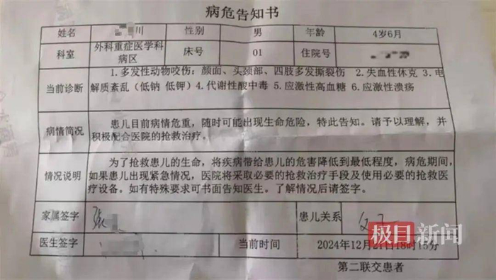 病危通知书 (受访者供图)“手术从12月21日晚八点半,一直到第二天6点左右。”古女士表示,由于川川脸部被咬伤多处,第一阶段手术主要是保住孩子性命,后面孩子的视力问题还未知,但一只耳朵很可能保不住,且脸颊面部伤口多、大,孩子毁容是肯定的了。除外伤外,川川后续还面临狂犬病发作和感染等问题,“现在还在ICU,都没脱离生命危险。”