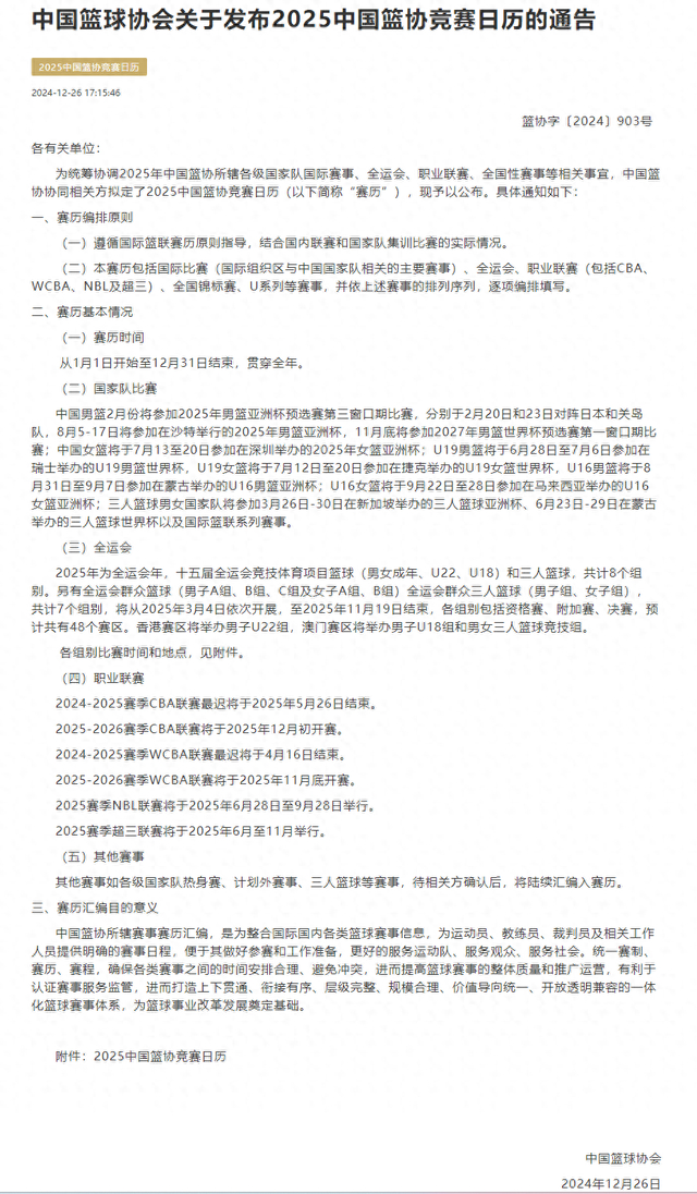 截图来源:中国篮协官网本次公布的赛历贯穿2025年全年,内容包括国际比赛、全运会、职业联赛、全国锦标赛、以及U系列等赛事等。