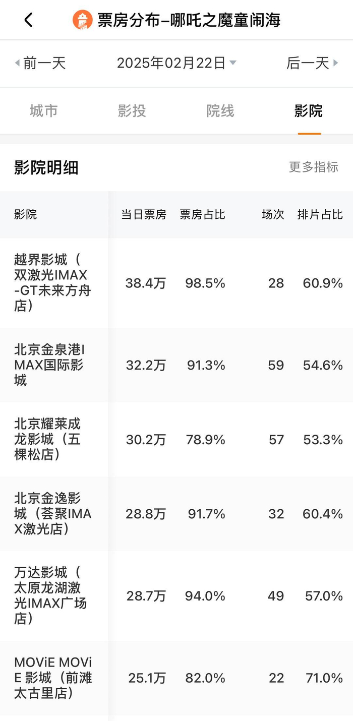有意思的是,已经出现“为一块大银幕奔赴一座城”的旅游联动盛况,亚洲最宽、全球第二宽的IMAX GT大银幕在贵阳越界影城(双激光IMAX-GT未来方舟店)9号厅,该厅每天的“哪吒”场次均显示满座,给力的上座率使得该影城已经连续多日登顶全国影院票房第一名了。截至记者发稿时,2月22日当天,该影城《哪吒2》票房已达39.3万元。
