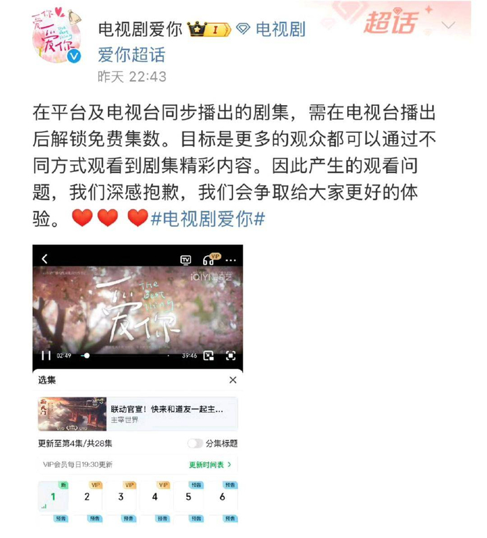 2月25日,针对被指第一集就锁V,电视剧《爱你》发文回应:在平台及电视台同步播出的剧集,需在电视台播出后解锁免费集数。目标是更多的观众都可以通过不同方式观看到剧集精彩内容。因此产生的观看问题,我们深感抱歉,我们会争取给大家更好的体验。