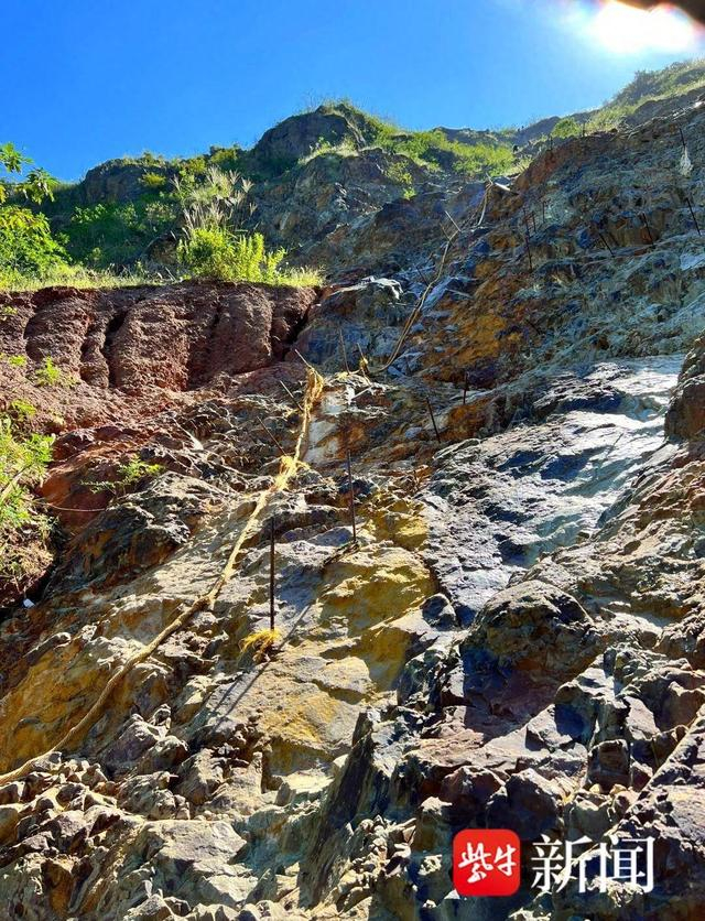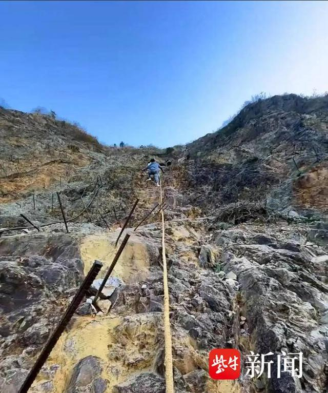3月12日,记者来到苏州高新区“钉子崖”,通往“钉子崖”的道路非常泥泞,由于刚下过雨,路上到处都是水坑以及碎石,附近有挖掘机正在作业。记者在现场看到,通往“钉子崖”的小路已经有围栏进行隔断,围栏处设置了“禁止攀爬”警示牌,提醒户外探险者严禁攀爬“钉子崖”。“钉子崖”上原有的绳索已经被剪断,只留下部分插入岩石的钢筋。