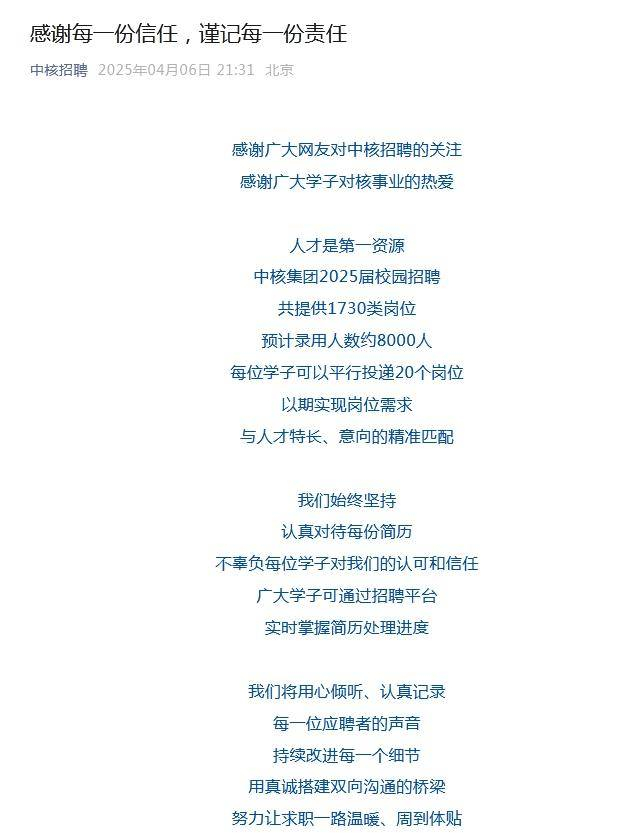 微信号“中核集团”截图6日晚,微信号“中核招聘”发布《感谢每一份信任,谨记每一份责任》推文,其中提到,中核集团2025届校园招聘共提供1730类岗位,预计录用人数约8000人,每位学子可以平行投递20个岗位。