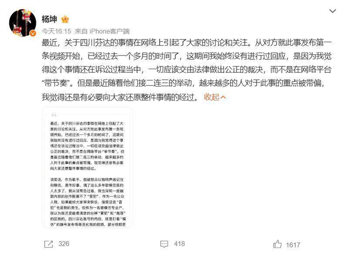文中透露,杨坤方最开始想通过平台投诉让其停止侵权。“可收到侵权提醒后,他们非但没收敛,反而变本加厉发布更多恶意内容并且靠此直播敛财。”对方嘴上说着和解,转头就开始把自己包装成“弱者”,紧接着把他推上舆论风口,甚至反过来道德绑架。杨坤质疑“四川芬达”不是真心道歉和悔过,只是为了“炒作赚流量”,靠争议涨粉百万,靠直播继续获利。