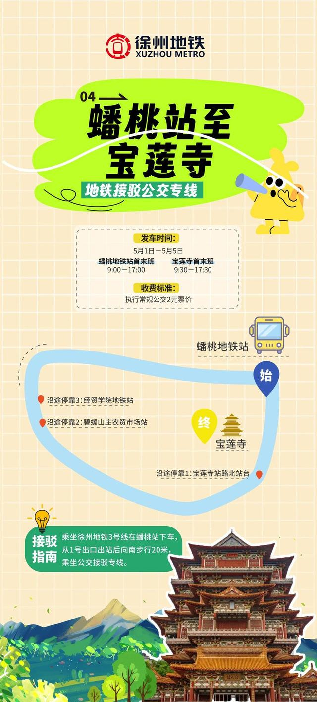 地铁到达,公交出发。今年五一期间,徐州地铁与徐州公交融合再升级,将新开通4条连接地铁站和景区的接驳专线。至此,龟山汉墓、宝莲寺、徐州乐园、欧乐堡海洋极地世界、方特乐园、九顶山野生动物园、园博园七大热门景点,通过6条接驳专线,实现地铁公交无缝衔接。