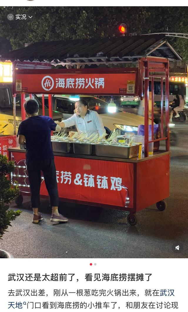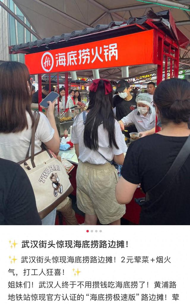 5月21日,有网友在社交媒体发文称在武汉天地门口看到了海底捞路边摊,“荤菜两元素菜一元,穿工服的小哥现场涮煮,这波操作太接地气了!”也有网友发出疑问:“真的是海底捞火锅的吗?会不会是冒牌的?”