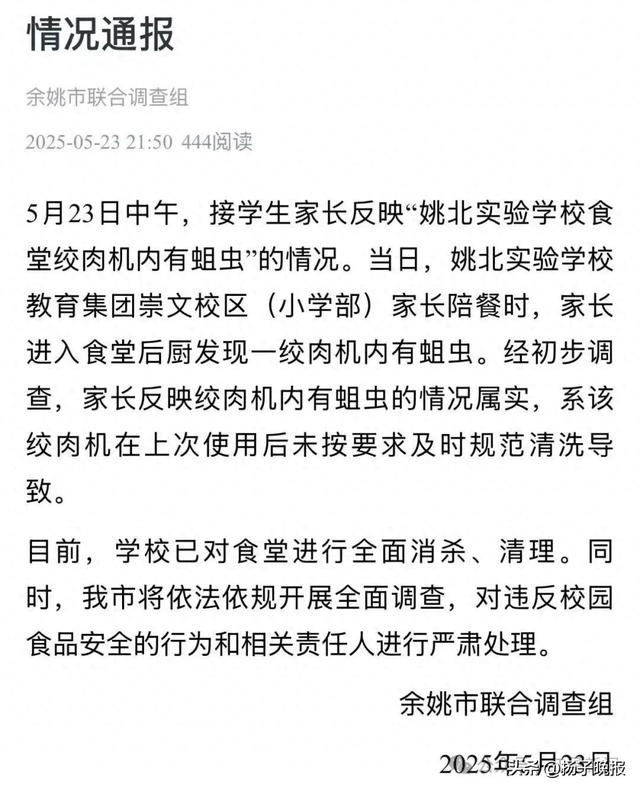 5月23日中午,接学生家长反映“姚北实验学校食堂绞肉机内有蛆虫”的情况。当日,姚北实验学校教育集团崇文校区(小学部)家长陪餐时,家长进入食堂后厨发现一绞肉机内有蛆虫。经初步调查,家长反映绞肉机内有蛆虫的情况属实,系该绞肉机在上次使用后未按要求及时规范清洗导致。