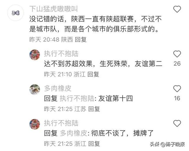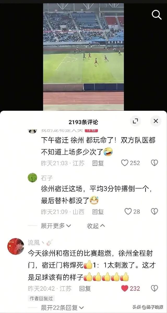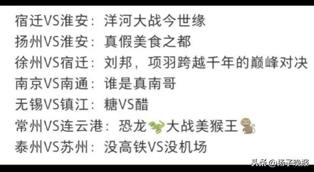 这里“没有假球,没有黑哨,只有恩怨,全是德比”“没有人情世故,全是对胜利的渴望”;南京连云港相遇,一方要“大圣爆烤盐水鸭”,一方要“踏平花果山”;南通出征,撂下一句“我以为在座只是成绩不行”;常州接连告负,观者惊呼“常州变巾州”;宿迁战徐州,淮安跳出来刷存在感:“没有韩信帮忙,刘邦未必能打过项羽”……