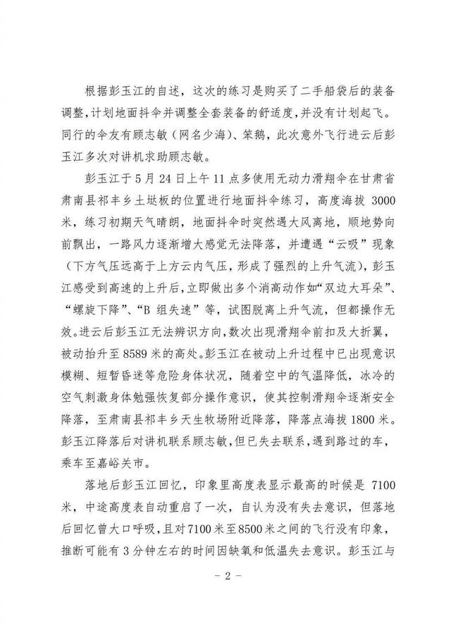 进云后彭玉江无法辨识方向,数次出现滑翔伞前扣及大折翼,被动抬升至8589米的高处。彭玉江在被动上升过程中已出现意识模糊、短暂昏迷等危险身体状况,随着空中的气温降低,冰冷的空气刺激身体勉强恢复部分操作意识,使其控制滑翔伞逐渐安全降落,至肃南县祁丰乡天生牧场附近降落,降落点海拔1800米。彭玉江降落后对讲机联系顾志敏,但已失去联系,遇到路过的车,乘车至嘉峪关市。