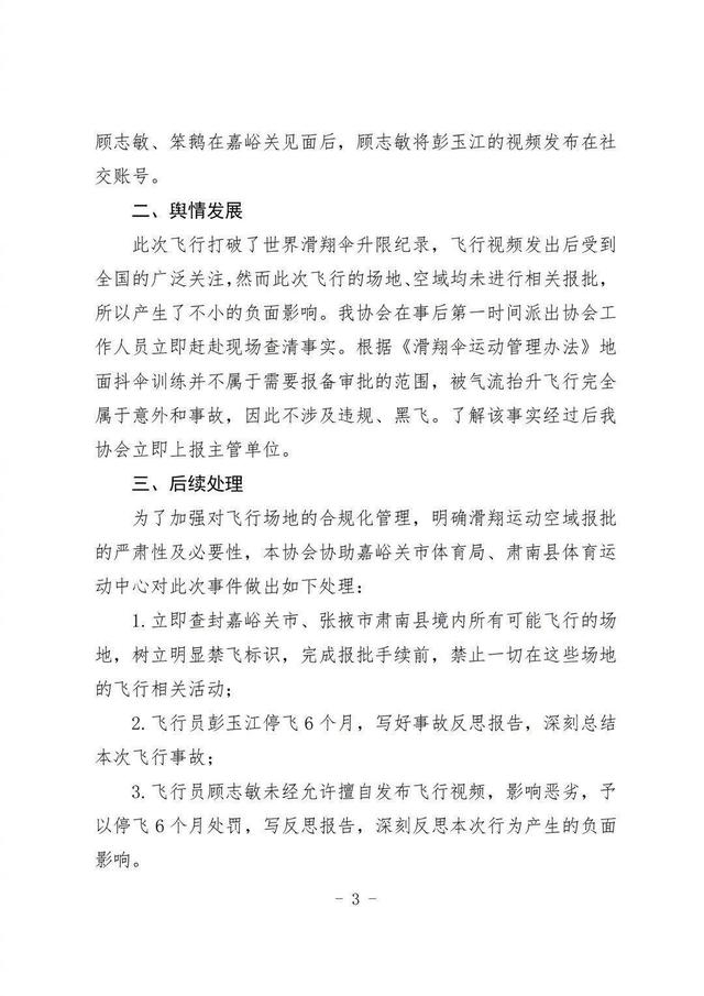 甘肃省航空协会会协助嘉峪关市体育局、肃南县体育运动中心对此次事件做出如下处理: