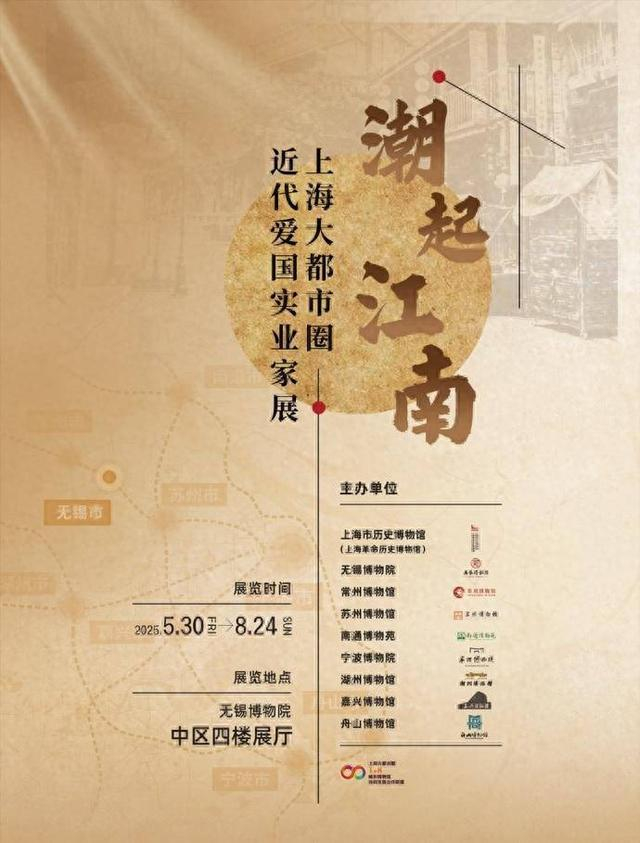 5月30日,由上海市历史博物馆(上海革命历史博物馆)、湖州博物馆、苏州博物馆、常州博物馆、南通博物苑、宁波博物院、嘉兴博物馆、舟山博物馆以及无锡博物院联合举办的“潮起江南——上海大都市圈近代爱国实业家展”在无锡博物院开幕,共展出近百件珍贵文物及图片资料,全面展示了上海大都市圈爱国实业家做强企业,造福地方,回馈社会,为国分忧的卓越贡献。