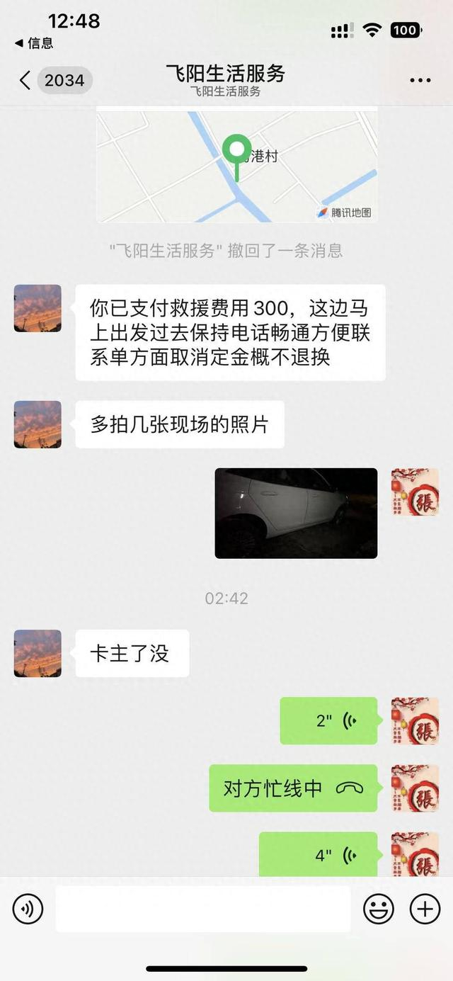 小张说,他随即通过手机在网上搜索“姜堰道路救援”,页面随即弹出若干“飞阳生活服务”可以提供服务的信息。根据页面提供的4006999680客服电话,小张与对方取得了联系,在加了对方微信后,双方约定救援费用500元,小张预付了300元定金,其余200元待救援成功再支付。