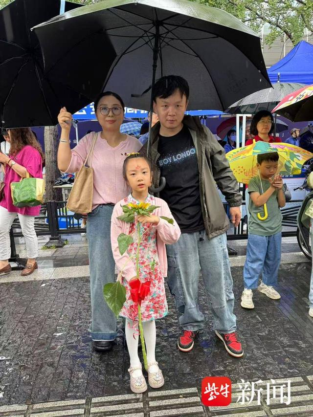 九中考点外,考生小王在爸妈,妹妹的目送下进入考场。妹妹手举着向日葵,雨天下格外明媚。“还有11年就轮到她高考啦!” 爸爸打趣道。