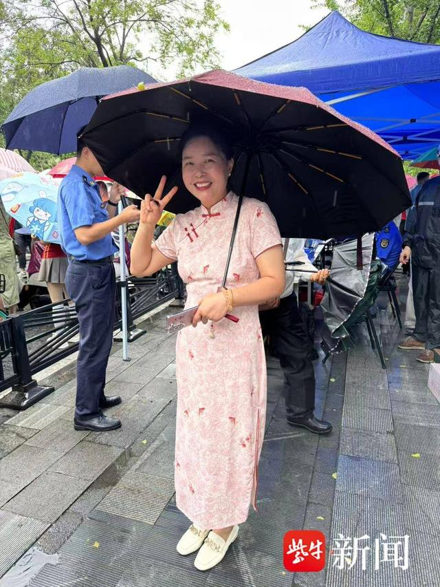 “今天特地打了红伞,穿了红旗袍,讨个好彩头,旗开得胜!”南京九中考点门前,人民中学考生家长冯女士一身红色,分外显眼。冯女士告诉记者,一家人早晨七点就出了门,七点二十到了考场。“下雨多少对儿子还是有一点影响的,不过孩子心态很放松。我们也和他说,不要焦虑,考分就在那里,尽力去考就是好的。”冯女士和一旁的送考家长聊起了考后安排,“你猜我家儿子考完想干嘛?烫头!”