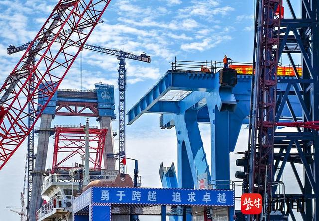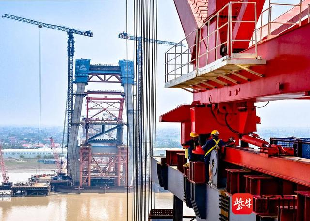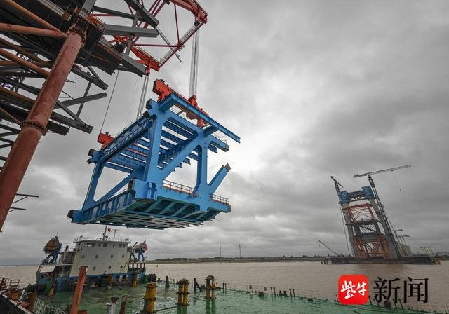 扬子晚报网6月8日讯(通讯员 崔永兴 王世琪 孟庆虎 刘彧铭 记者 笪越) 6月8日,中铁大桥局承建的沪渝蓉高铁V标崇启公铁长江大桥主通航孔桥首吊钢梁顺利架设完成。