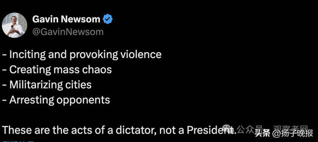 而加州州长加文·纽森则在社交平台X上发帖指责特朗普政府“独裁”。