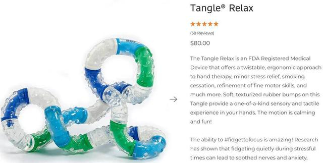 据其介绍,“研究表明,在压力大的时候安静地坐立不安会导致神经紧张和焦虑。各地的教育工作者在课堂上使用Tangle来帮助阅读和数学理解,并保持不安分的头脑和双手集中。Tangle为手部治疗、轻微压力缓解、戒烟、精细运动技能的磨练等提供了可扭曲的、符合人体工程学的方法,可以缓解神经和焦虑,更好地控制身体,集中注意力。”