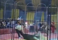 记者注意到,视频内容是一马戏团的表演现场,金属笼中有两名男子及一头幼年狗熊正在进行表演。在表演过程中,狗熊突然扑向一名穿牛仔裤的男子,撕咬男子后一齐倒在地上,该男子旋即遭到狗熊拖行,不得不费力才从狗熊身下挣脱。值得注意的是,视频中另一名男子始终手持绳索拴住了狗熊脖子,尝试将熊和人分开。当受袭击男子挣脱出来后,狗熊再次扑向他,导致其摔倒在地,手中抓着绳子的男子随即紧握绳索,制止狗熊继续活动。据视频显示,狗熊袭击人似乎并未造成严重伤害,受袭击男子在挣脱后仍可行走,金属笼内也未见明显血迹。